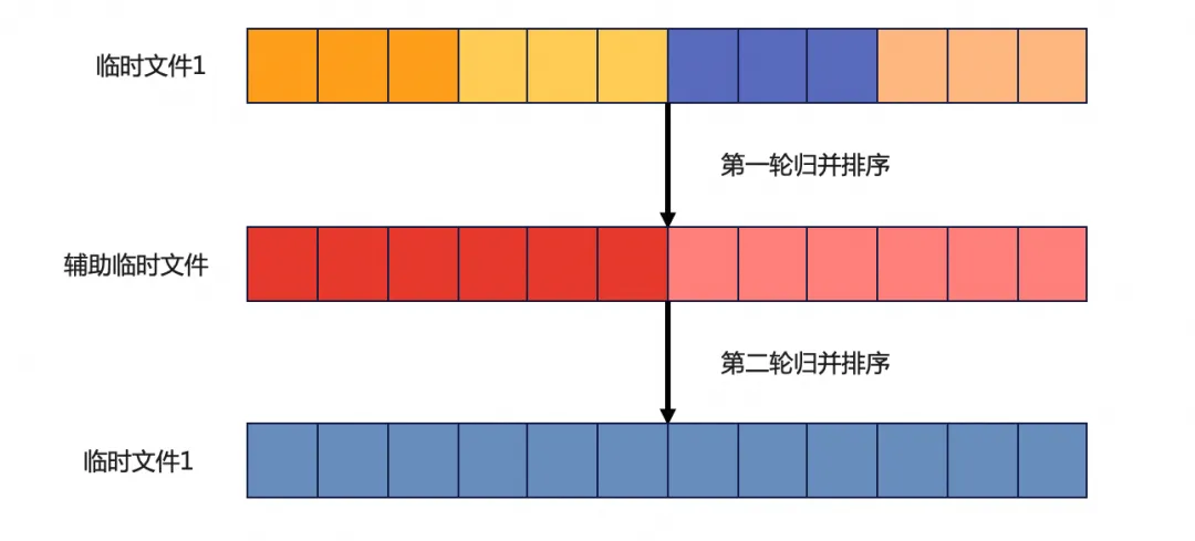DDL线程文件排序过程使用归并排序算法,会创建一个新的临时文件辅助排序。假设临时文件1包含4个有序list,那么第一轮归并排序后得到包含两个有序的list的文件,两轮归并排序后便可以得到一个全局有序的临时文件: