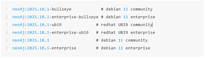 Neo4j 镜像的变体根据社区版/企业版以及用作基础镜像的操作系统进行标记。