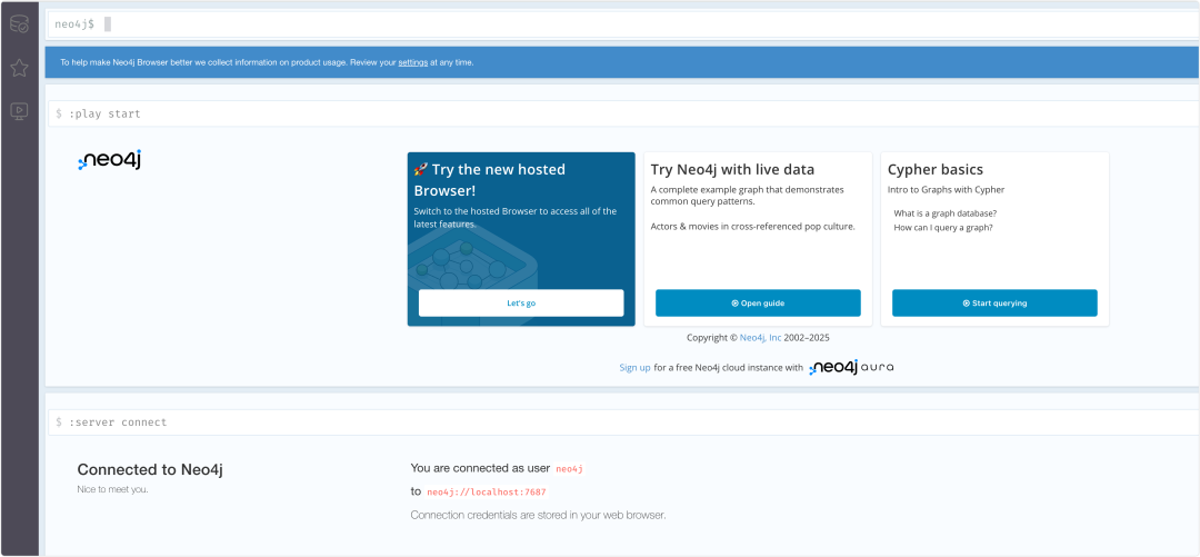 您可以通过在 Web 浏览器中打开 http://localhost:7474/ (Neo4j 的浏览器界面)来试用您的 Neo4j 容器 。默认情况下,Neo4j 需要身份验证,并在首次连接时提示您使用用户名/密码登录 neo4j/neo4j 。之后,系统会提示您设置新密码。