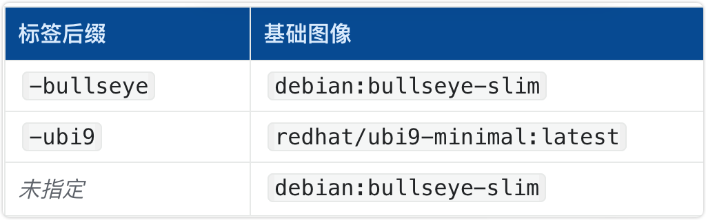 debian:bullseye-slim ,也 redhat/ubi9-minimal:latest 可以作为基础镜像使用。默认值为 debian:bullseye-slim 。
