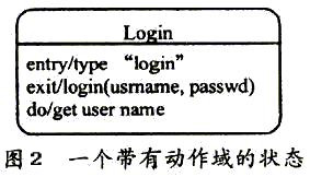 中间状态包括两个区域:名字域和内部转移域,如图2所示。图中内部转移域是可选的,其中所列的动作将在对象处于该状态时执行,且该动作的执行并不改变对象的状态。