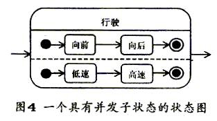 一个状态可以进一步地细化为多个子状态,我们将可以进一步细化的状态称作复合状态。子状态之间有"或关系"和"与关系"两种关系。或关系(如图3)说明在某一时刻仅可到达一个子状态。例如,一个处于行驶状态的汽车,在"行驶"这个复合状态中有向前和向后两个不同的子状态,在某一时刻汽车要么向前,要么向后。与关系( 如图4)说明复合状态中在某一时刻可同时到达多个子状态(称为并发子状态)。具有并发子状态的状态图称为并发状态图。