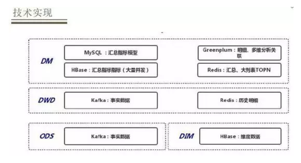 Redis 里面。在DIM层主要做一些高并发维度的查询关联,一般将其存放在HBase里面,对于DIM层比价复杂,需要综合考虑对于数据落地的要求以及具体的查询引擎来选择不同的存储方式。对于常见的指标汇总模型直接放在