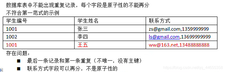 数据库表中不能出现重复记录,每个字段是原子性的不能再分。