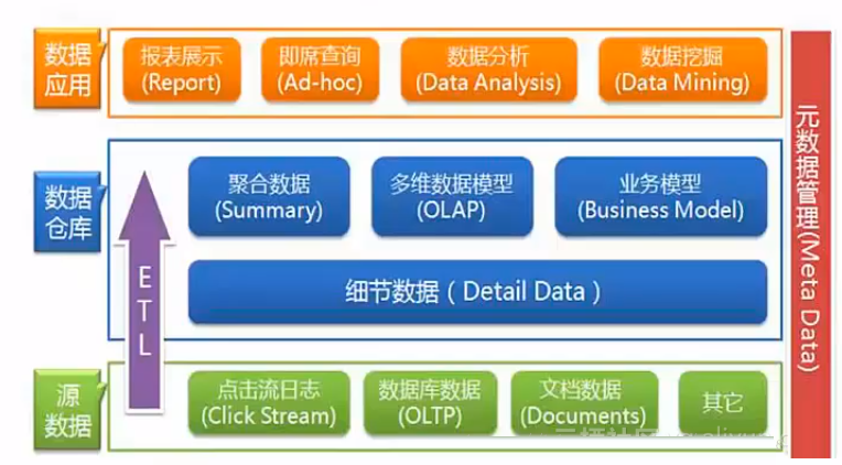 数据仓库是一个面向主题的、集成的、非易失的、反映历史变化的数据集合,用于支持管理决策。其结构图如下所示: