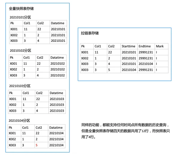 如上示例拉链表供记录了三个id的历史变化情况,支持任何时间段历史数据的查询。