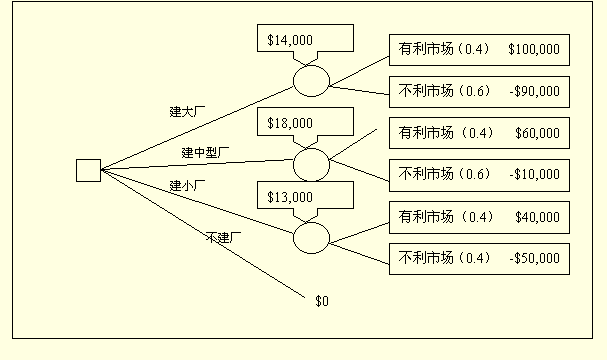 EMV(建小厂)=(0.4)* ($40,000)+(0.6)*(-$5,000)=+$13,000