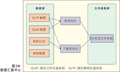 数据汇集调度中心实现对接入本平台的业务数据的汇集,可以解决不同数据的规约问题,并支持各种不同的源数据格式。源数据格式支持联机事务处理系统(OLTP)数据、联机分析处理系统(OLAP)数据、各种日志数据、爬虫数据等,同时要提供多种数据同步方式,例如数据库实时同步、socket消息同步、文件传输协议同步等各种各样的方式,如图3所示。