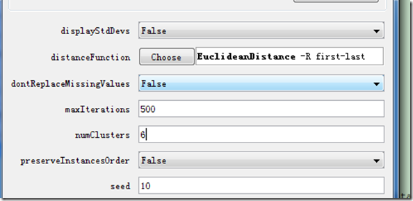点击“Choose”按钮,选择聚类算法。这里先选择了SimpleKMeans,单机“Choose”旁边的输入框,可以设置算法参数