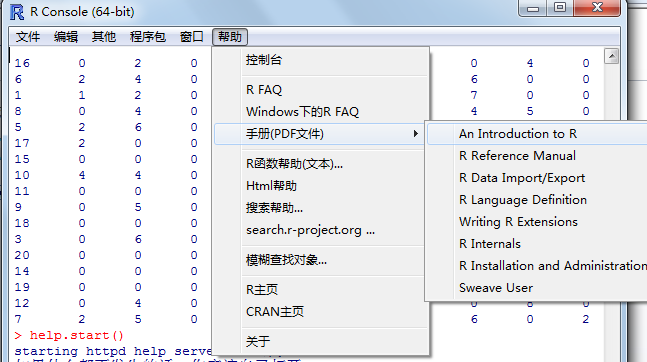 R有许多函数,忘记函数使用方法和参数很正常,关键是要知道如何找到相关资料。可以在R命令行中输入“hlep(function_name)”的方式,查看任何函数的详细说明。当然,更多帮助,可以通过R主菜单的帮助下获得,如下图