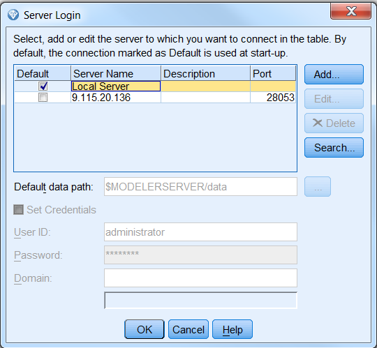 打开 IBM SPSS Modeler 客户端,点击左下角的 Server 按钮,选择要连接的 Modeler
