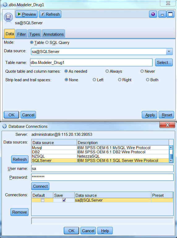 连接上 Modeler Server 之后,在源选项双击数据库节点,然后就可以添加数据库源节点到数据流工作区,双击节点,在数据项选择添加一个数据库连接,然后