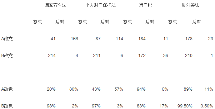 有A、B两个政党对四个议题进行投票,A政党有211个国会议员,B政党有223个国会议员。下表统计了政党对四个议题赞成或反对的票数。