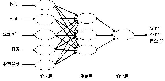 图中每个椭圆型节点接受输入数据,将数据处理后输出。输入层节点接受客户信息的输入,然后将数据传递给隐藏层,隐藏层将数据传递给输出层,输出层输出客户属于哪类信用卡。这类似于人脑神经元受到刺激时,神经脉冲从一个神经元传递到另一个神经元。