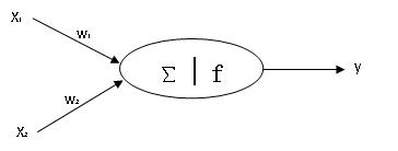 每个神经元节点内部包含有一个组合函数∑和激活函数f。X1, X2是其他神经元的输出值,对此神经元来说是输入值,组合函数将输入值组合后传递给激活函数。激活函数经过特定的计算后得到输出值y,y有被传递给其他神经元。