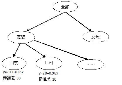 使用自动回归树得到上图的模型,假如山东销售店提交的计划童装数量是500套,预计销售量是-100+0.6×500=200套,按6Sigma原则,有99.97%的概率实际销售量可能是200±90套。广州提交计划童装300套,预计销售量是20+0.98×300=314±30套。广州的销售店制定的童装计划比山东的准确。