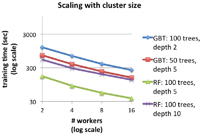 最后一张图表展示了使用更大的计算机集群来解决上述问题的效果,结论是GBTs和随机森林在大集群上速度得到显著提升。例如说,单树深度为2的GBTs在16个节点上的训练速度大约是在2个节点上的4.7倍。数据集越大则效果提升的越明显。