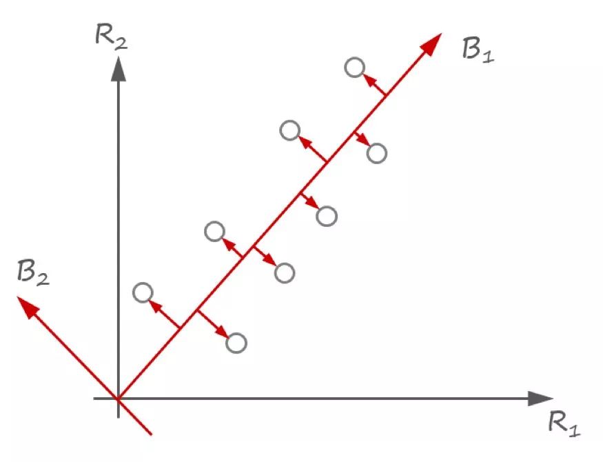 集合中的每个点沿着 R_1 和 R_2 维度都有着很大的坐标值并显示出数据的复杂而不规则的结构。然而,在另一个坐标系