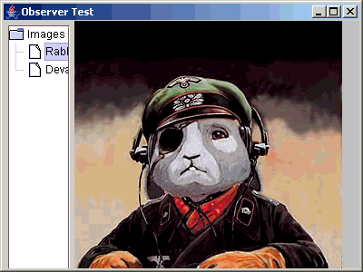 回到本文一开始的那个Explorer的例子,我们考虑做一个简单的图片浏览器,使树型选择组件和图片浏览面板在两个不同的类中,其中图片浏览面板根据所选择的树的节点显示相应的图片,所以图片浏览面板是一个observer,树是subject。由于Java单根继承的原因,我们不能同时继承JPanel和Observable,但可以用对象的组合把一个subject放到我们的类当中,并通过TreeSelectionListener触发subject的setChanged方法,并通过notifyObservers方法通知observer。