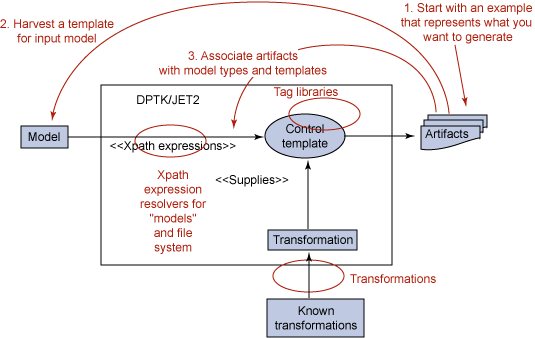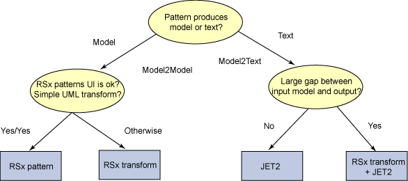 - 如果输入模型是 UML 的,或是带有转换所不需要的重要内容的 EMF 模型,那么就开发一个 RSx 转换,从输入模型中抽取恰当的信息,放入直接匹配转换需求的中间文本或 EMF 模型中,并使用 JET2。