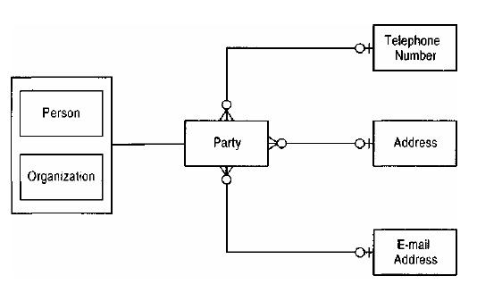 Fowler同志提出了Party模式来描述此种类型的模型。我们用一种通用(父)的类型来定义人和公司,这样,只需要在模型中指定该通用类型和联系方式的关系即可,而人和公司则从属于该类类型。其模型如下: