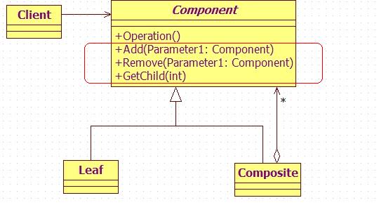 上面的类图是属于安全模式的,因为 Leaf 类不具有 add 、 remove 等方法,这些具体方法是被下置到