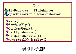 Joe是一名OO程序员,他为一家开发模拟鸭子池塘游戏的公司工作,该公司的主要产品是一种可以模拟展示多种会游泳和呷呷叫的鸭子的游戏。这个游戏是使用标准的面向对象技术开发的,系统里所有鸭子都继承于Duck基类,系统的核心类图如下: