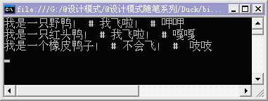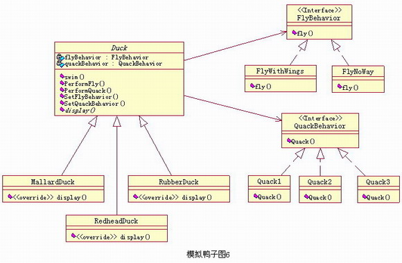 如图所示,在Duck基类里实现了公共的quack()和swim()方法,而MallardDuck和RedheadDuck可以分别覆盖实现自己的display()方法,这样即重用了公共的部分,又支持不同子类的个性化扩展。从目前的情况看,这是一个很好的设计,哈!
