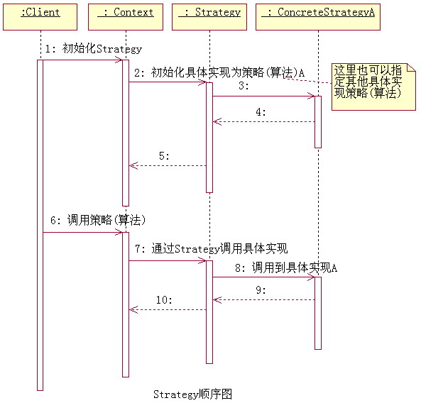 怎么样,大家看出来了吧,其实在这段代码里,ArrayList相当于Strategy模式中的Context(应用场景)部分,而IComparer相当于Strategy(抽象策略类)部分,myReverserClass相当于ConcreteStrategy(具体策略类)部分。我们这里抛开myReverserClass类的Compare方法如何具体实现不谈,我们只要知道这是一个具体策略类,它提供了应用场景需要的具体算法,它实现了抽象策略类接口,而应用场景通过抽象策略类动态调用到了具体策略类中的算法。哈!所以这是一个十分典型的Strategy模式的应用。
