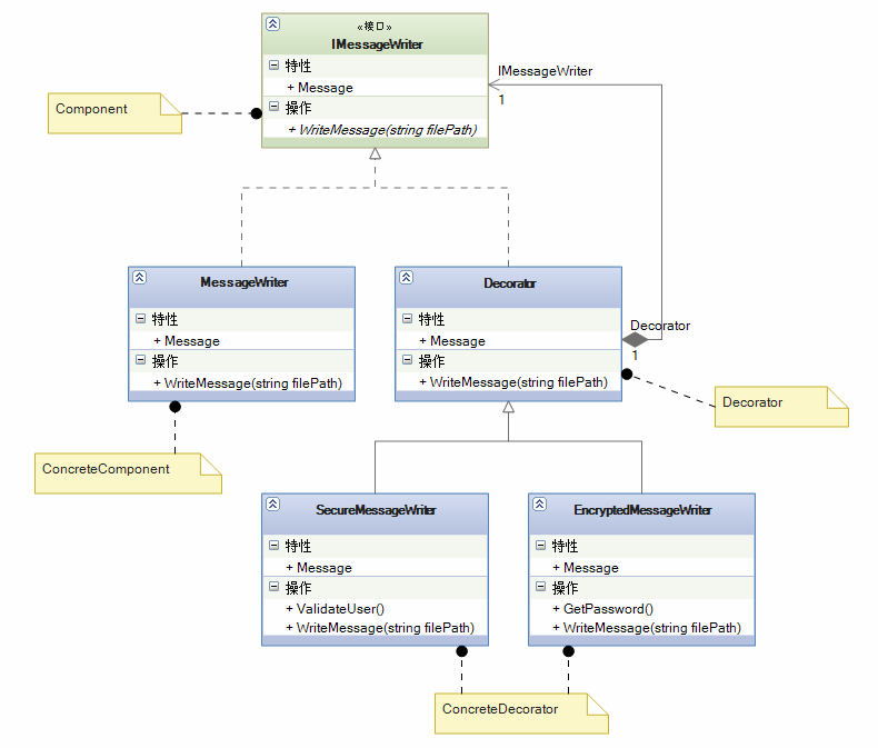 到目前为止,我们已有两部分,分别是Component:基本行为,即在我们例子中是IMessageWriter和用于读的IMessageReader;和ConcreteComponent,即我们实现的读写行为:MessageWriter和MessageReader。
