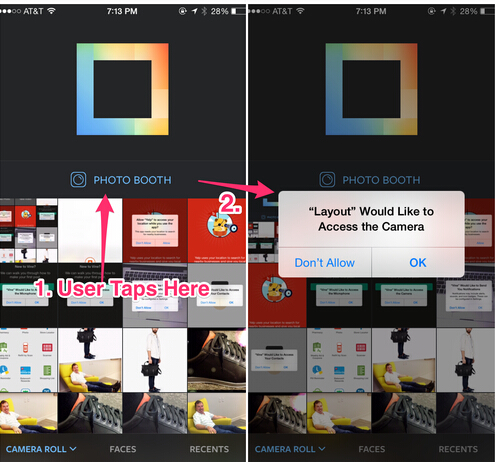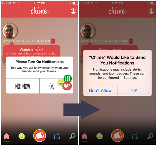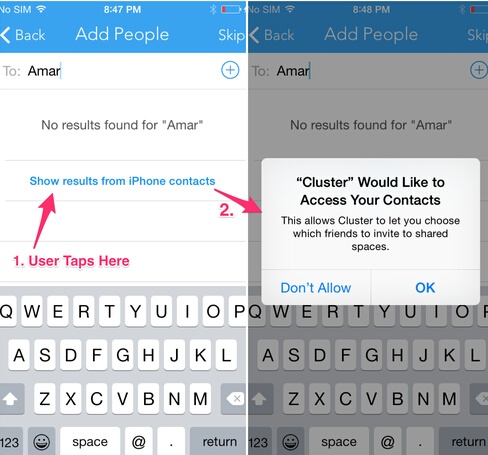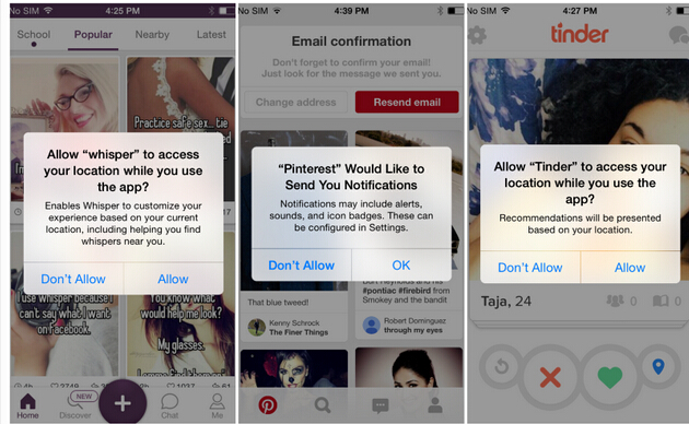 如上图所示,左屏当中的对话框完全是定制化的UI元素,用户点击OK之后才会出现真正的iOS授权申请。这种方式有两点好处: