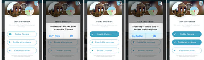 如果app较为复杂,功能涉及到的系统授权较多,那么与一个接一个的弹框相比,清单模式更具积极的引导性。例如下图所示的Periscope所做的这样,将所需授权的信息以清单的形式展示出来,使其在感觉上像是某种正式的任务流程,用户每点击一个任务便会弹出一个授权申请,同意授权后,该任务完成。