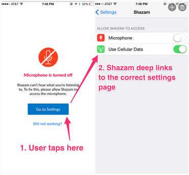 不过从iOS 8开始,app可以在自己的界面中提供deep-link将用户直接带去系统设置界面。下图演示的就是一旦用户拒绝在Shazam当中授权,他们仍可以点击“Go to Settings”按钮,一键进入系统设置,重新打开授权。