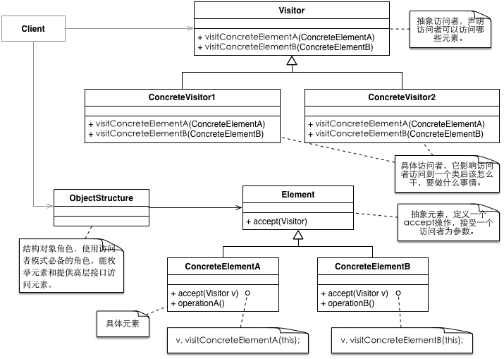 表示一个作用于某对象结构中的各元素的操作。它使你可以在不改变各元素的类的前提下定义作用于这些元素的新操作。
