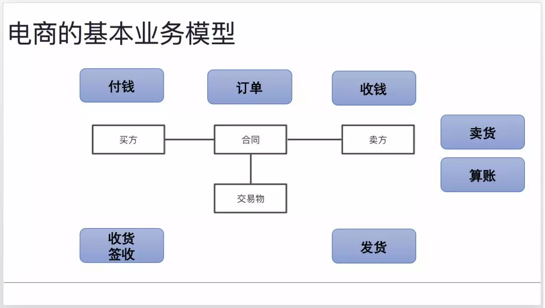 们再来看一下电商业务的基本模型。们在电商平台所完成的的购买行为,其实就是买卖双方,围绕着交易物,以双方认可的价格签订合同后,展开的履约行为。签约生成的合同,就是订单,买方付钱后合同开始生效,卖方收钱发货,买方收货签收后,合同结束。卖方还要具备卖货,算账等能力。
