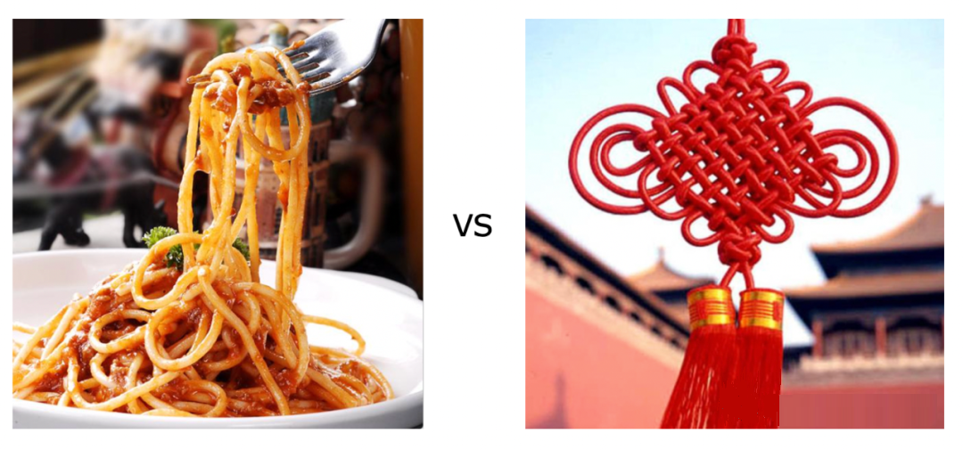 复杂可能是现状业务就复杂,也可能是业务日渐演变成复杂。复杂来自规模在变,比如几个业务对象的逻辑不复杂,几十上百个业务对象就会变得错综复杂。复杂来自结构化不足,比如下图所示,结构化的中国结比非结构化的意大利面更有序、易于大脑理解。此外,一旦协同方多了,如何协同不同团队完成软件交付也是一种复杂。