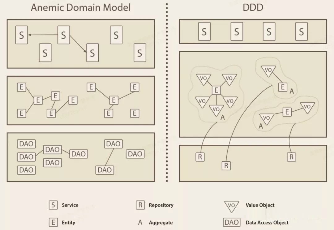 2. 聚合是DDD最小的复用单元,粒度更粗。数据模型设计里领域实体的数量跟表数量一一对应,数据表是最小的复用单元,粒度太细。导致业务逻辑对应的实现类需要访问很多的领域实体,实现类之间的调用关系发散而错综复杂。下图是贫血模型和DDD富血模型的区别。