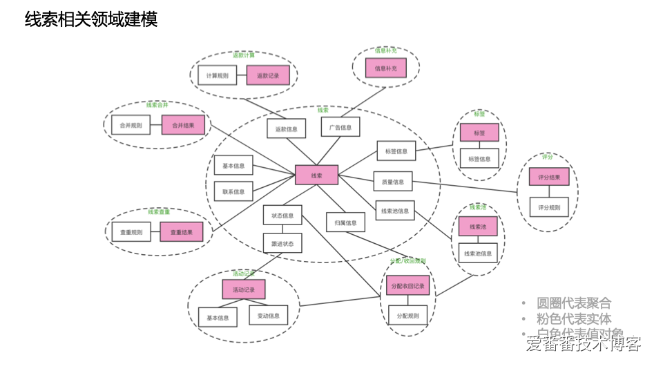 线索是个聚合,线索实体是该聚合的根实体,状态信息、联系方式信息等是附属聚合的值对象 |