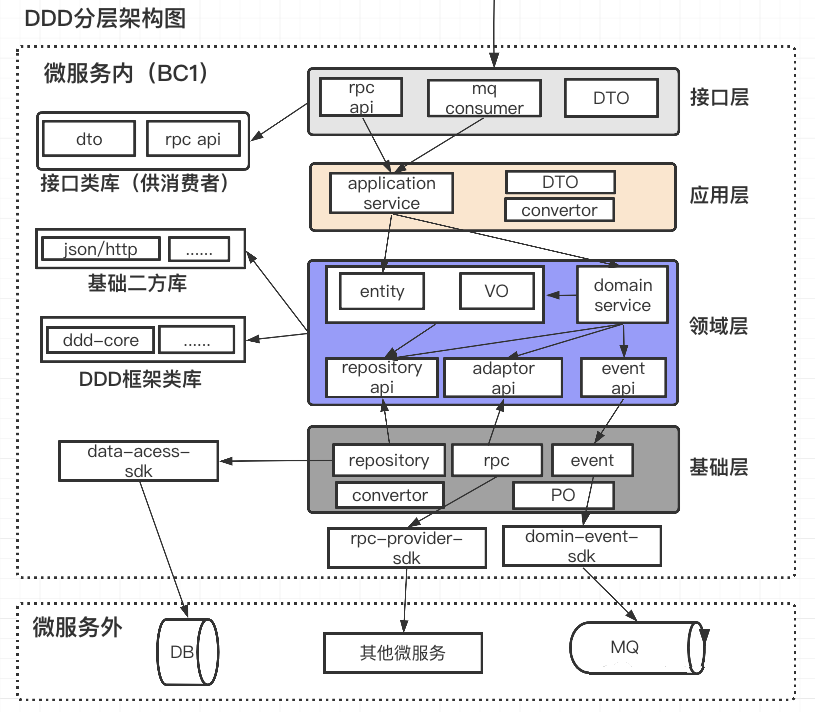 业界自从DDD的分层架构提出后陆续出现过洋葱架构、六边形架构、整洁架构等,其目标都是为了分离业务和技术,保证领域模型的纯粹性。下图是结合业界架构实践后定制的分层架构,具有以下几个特点: