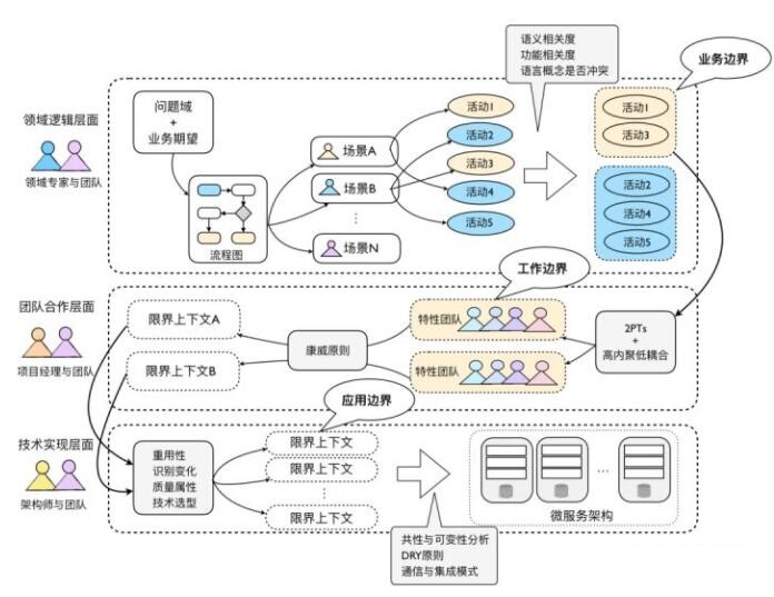 对于上下文的识别,没有可遵循的标准可走,从不同的角度切入将会识别到不同的上下文,可从张逸老师的领域驱动设计实践中窥之一二,以业务复杂度、管理复杂度和技术复杂度出发,面对这三个角度去依次分析,从业务视角、工作视角、应用视角去识别,进而识别出准确的上下文,通过不断的分析斟酌考虑,逐渐识别出符合当前预期的上下文,如在实际操作环节发觉当前上下文的设计显得不那么合理,还可再进行变动、拆分上下文。