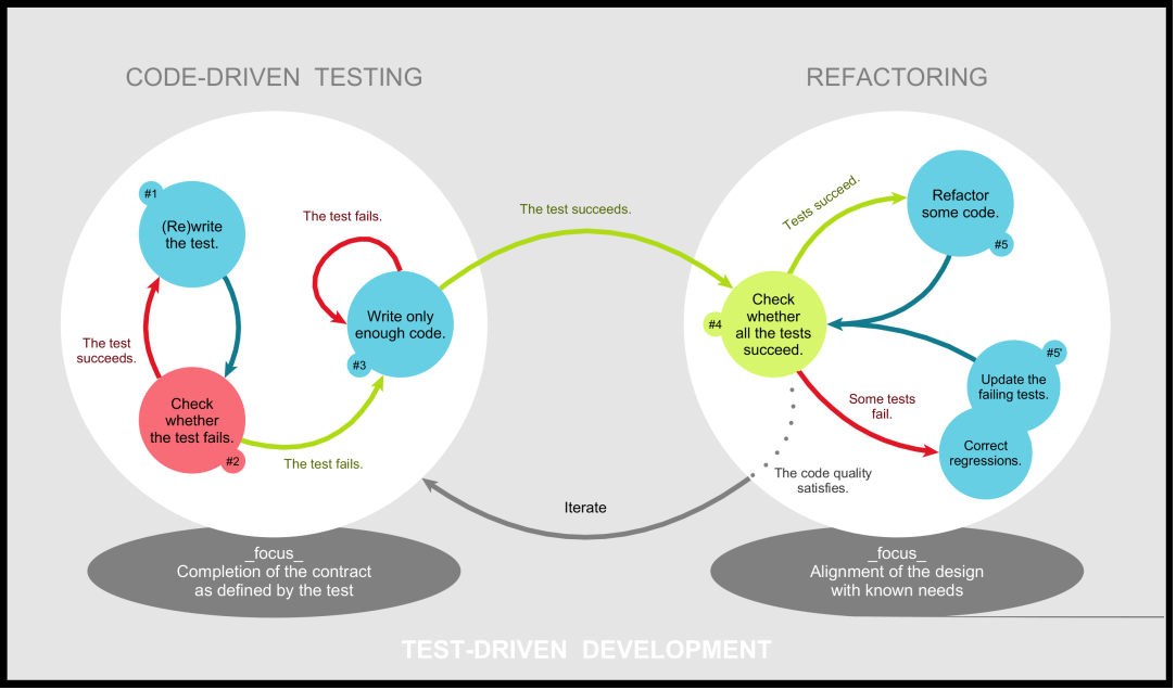 测试驱动开发(TDD)要求以测试作为开发过程的中心,要求在编写任何代码之前,首先编写用于产码行为的测试,而编写的代码又要以使测试通过为目标。TDD要求测试可以完全自动化地运行,并在对代码重构前后必须运行测试。