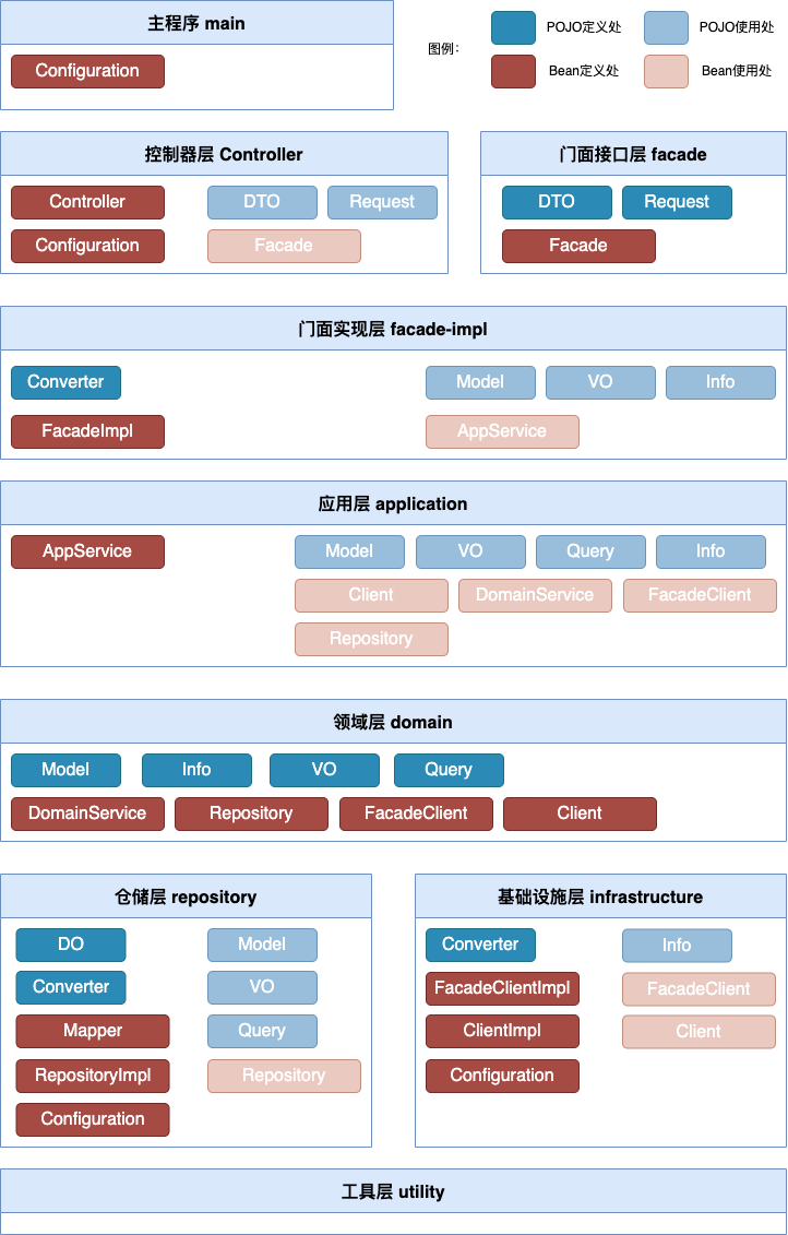 和业务无关的工具方法都放在这里,比如Utils类,全局通用Exception定义等。utility会被整个项目其他模块直接或间接依赖,必须保证其无业务语义。