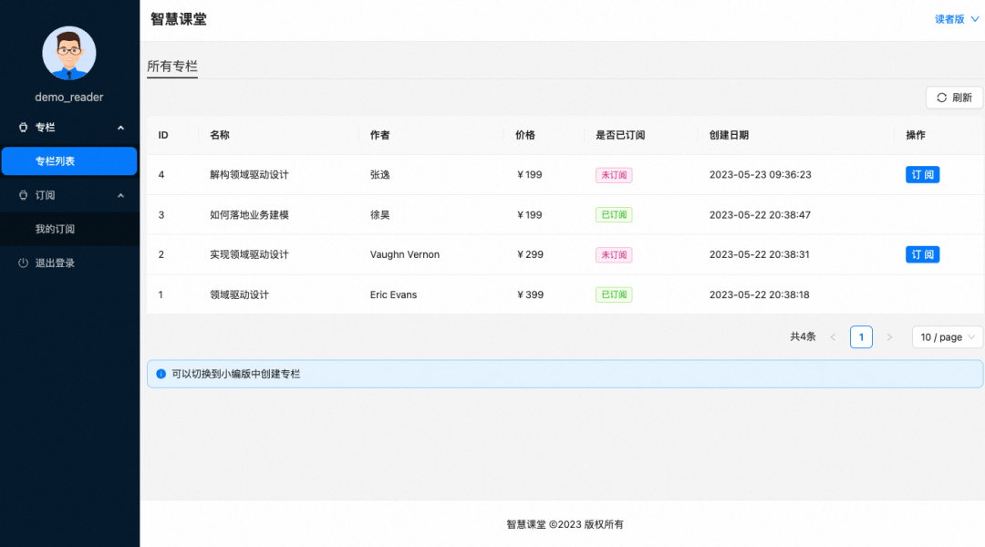 演示项目中可以用读者和小编两种身份登录,小编可以创建专栏,读者可以订阅专栏和查看已订阅的专栏。