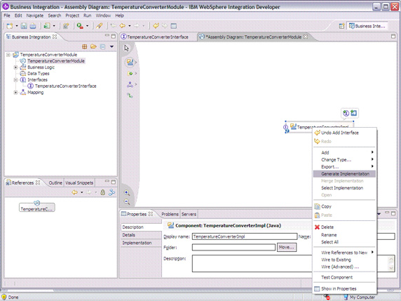 Java 创建实现(服务组件),如下所示。Assembly Editor 属于 WebSphere Integration Developer,允许开发人员通过接口(导入和导出)和绑定来连接