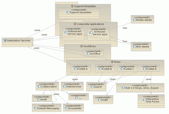 组合应用程序中的每个部分都可能包含预先构建的、具有特定功能和相关联的工作流的 Portlet。交互服务还可以具有内置的筛选功能、基于浏览器的配置向导、交互的 Web 窗体、搜索、Web 2.0 技术和协作。例如,协作服务组件是一个完全集成的、基于门户的协作环境,该环境包括电子邮件、日历和日程安排、即时消息传递、Web 会议、文档以及 Web 内容管理。