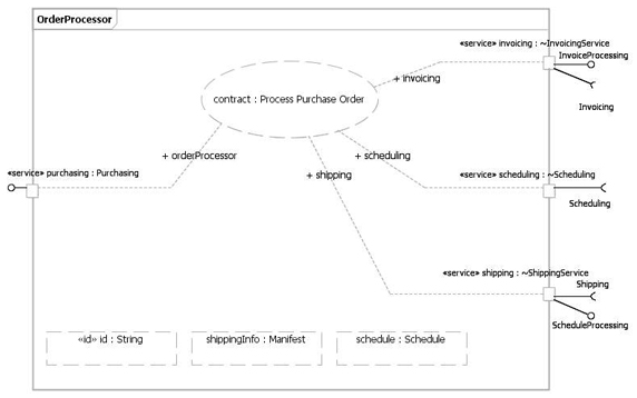 这一服务将由 OrderProcessor 服务提供者提供。OrderProcessor 是一个合成要素,它通过将其他服务提供者(根据需求契约设计的)连接在一起来提供一个服务。也就是说被提供的服务方法的某些方面被设计用来以某种方式使用其他服务提供者。这一合成要素通过它的购买服务端口提供