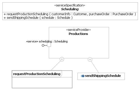 3 部分 服务实现中,我们对在服务提供者:Invoice、Productions 和 Shipper 中作为结果的服务规范的实现进行建模。每一个合成要素依照服务规范提供服务和功能。每一个被提供的服务操作都有一个描述服务如何真正执行的方法。方法可以是任何的