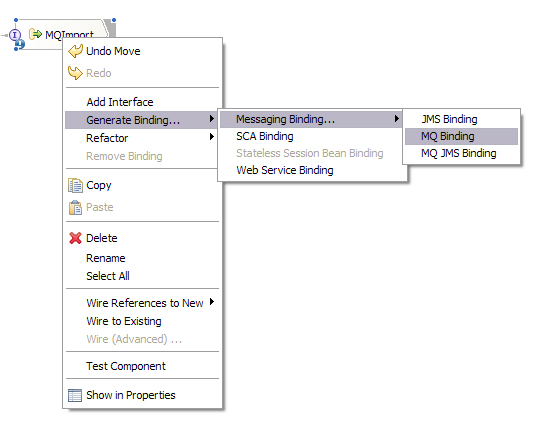 - 现在,将生成绑定来将此导入和前面创建的 WebSphere MQ 队列连接起来。方法是:右键单击