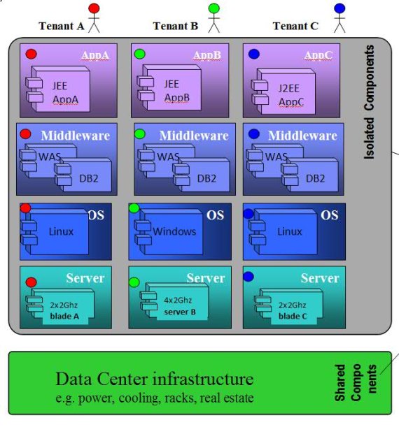租户只共享数据中心的基础结构(比如供电和制冷),但是使用应用程序、中间件、操作系统和服务器的不同实例。在图