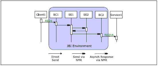 - BC1将传入的请求格式化为NM,然后通过NMR路由该消息。该场景中JBI实例将到Service1的请求消息发送到SE1。